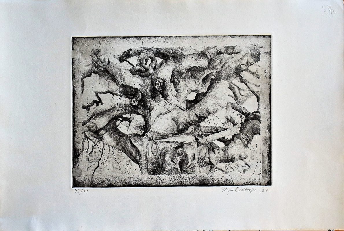 Raquel Fábrega, Composición surrealista, grabado, edición 60 ejemplares, numerado y firmado a lápiz, plancha 24,50×32,50 cms. y papel 38×56 cms.