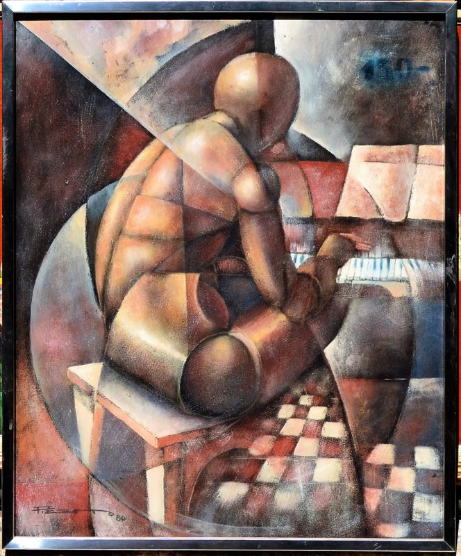 Roberto L. Pizarro 1980, Maniquí al piano de espaldas, pintura oleo sobre tabla, enmarcado, pintura 61×50 cms. y marco 63×52 cms.