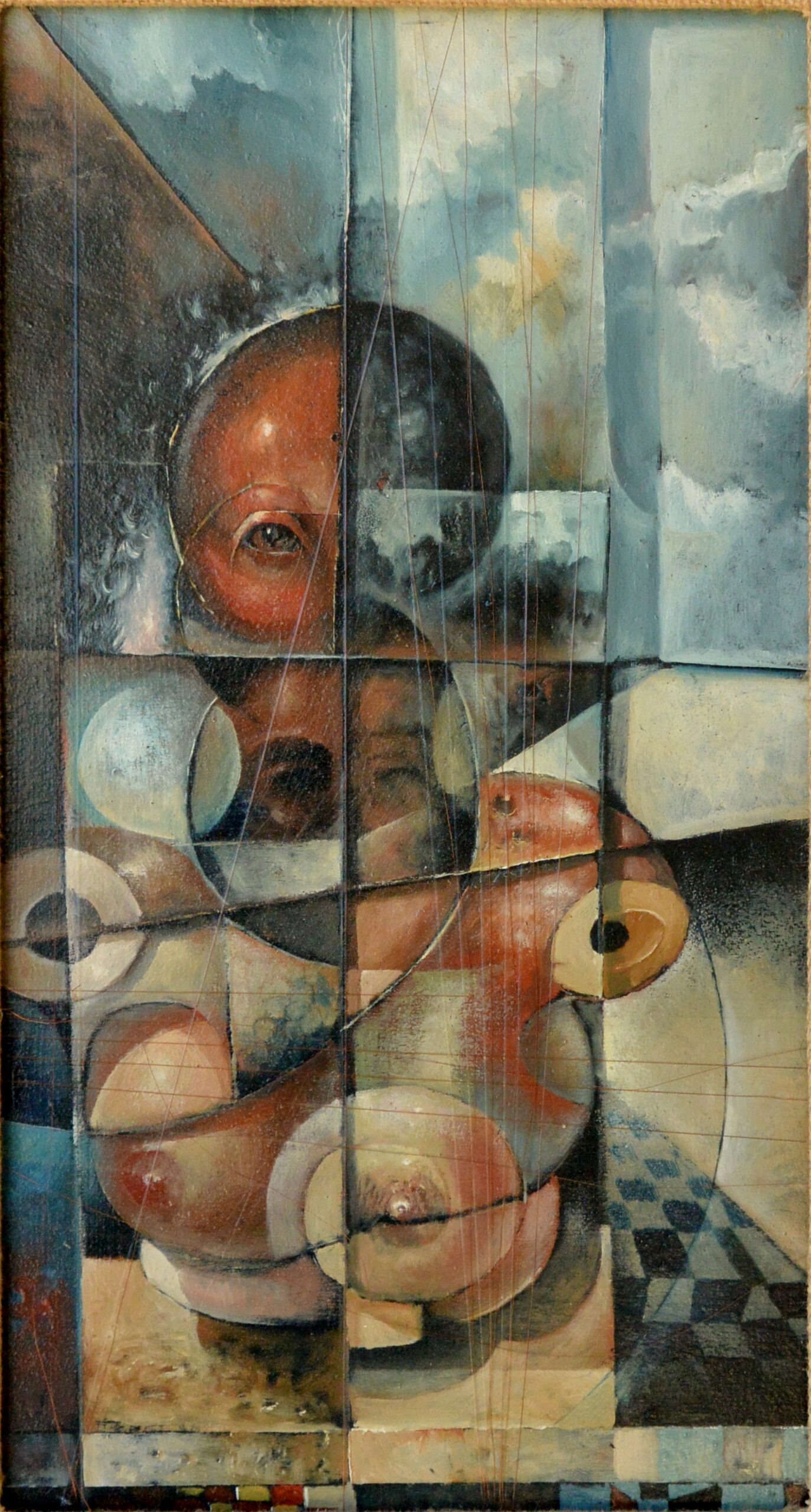 Roberto L. Pizarro, Maniquies con hilos de cobre, pintura oleo tabla, enmarcado, pintura 35×19 cms. y marco 48×32,50 cms.