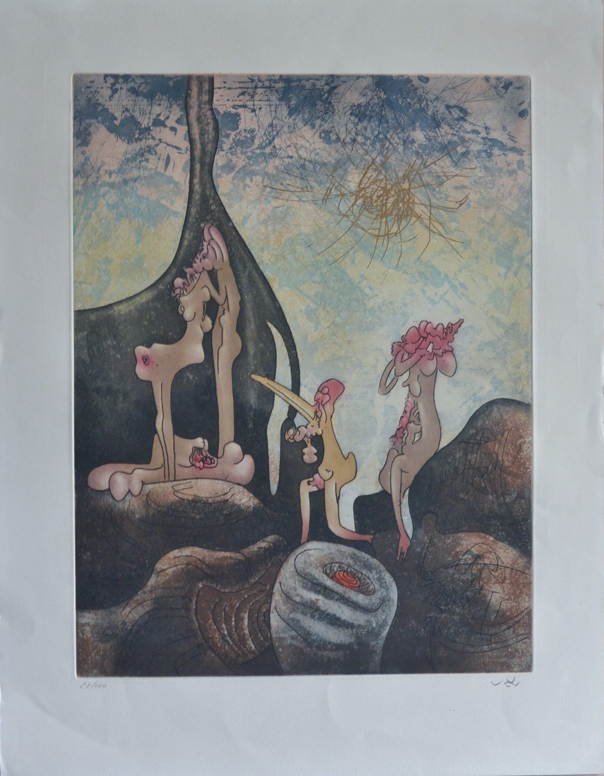 Roberto Matta, Composición, grabado aguafuerte y aguatinta, numerado 28/100 y firmado a lápiz, papel 64,50×50 cms. y plancha 50×37 cms.