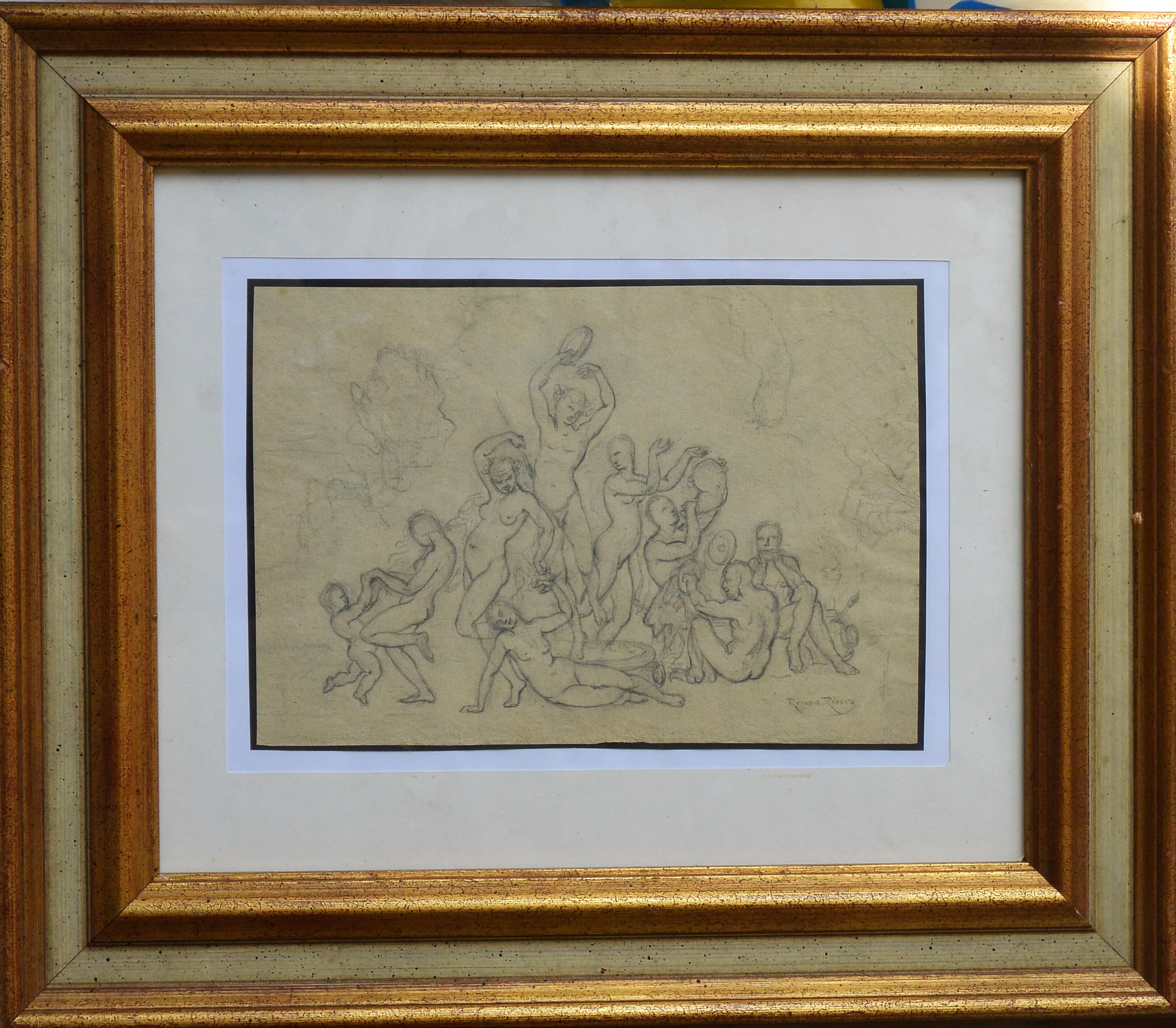 Roman Ribera, Fiesta en el campo, dibujo lápiz papel, enmarcado, dibujo 15×22 cms. y marco 33×39 cms.