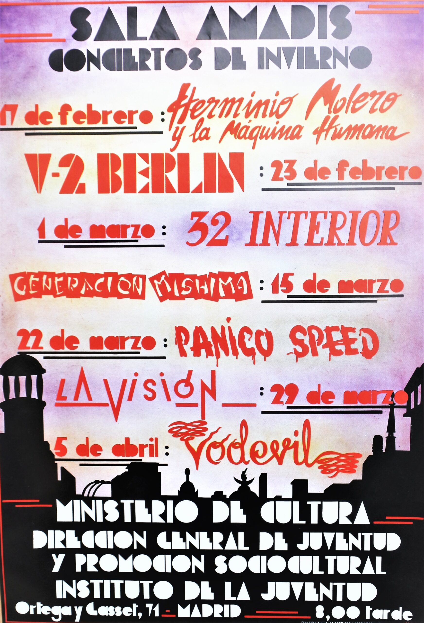 Sala Amadis, Conciertos de invierno, cartel original editado por la Dirección General de Juventud en 1984, 69×48 cms.