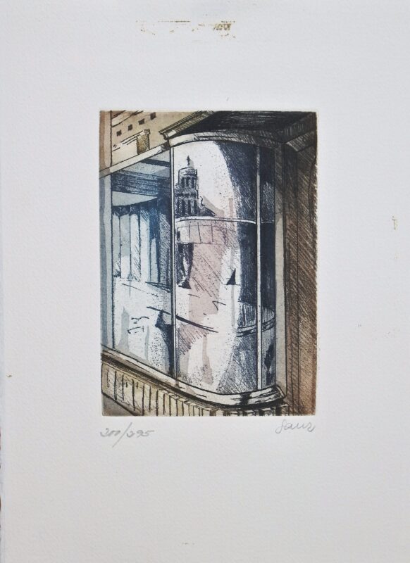 Sanz, Paisaje urbano, grabado aguafuerte, edición 295 ejemplares, numerado y firmado a lápiz, plancha 15×10,50 y papel 28,50×21 cms.