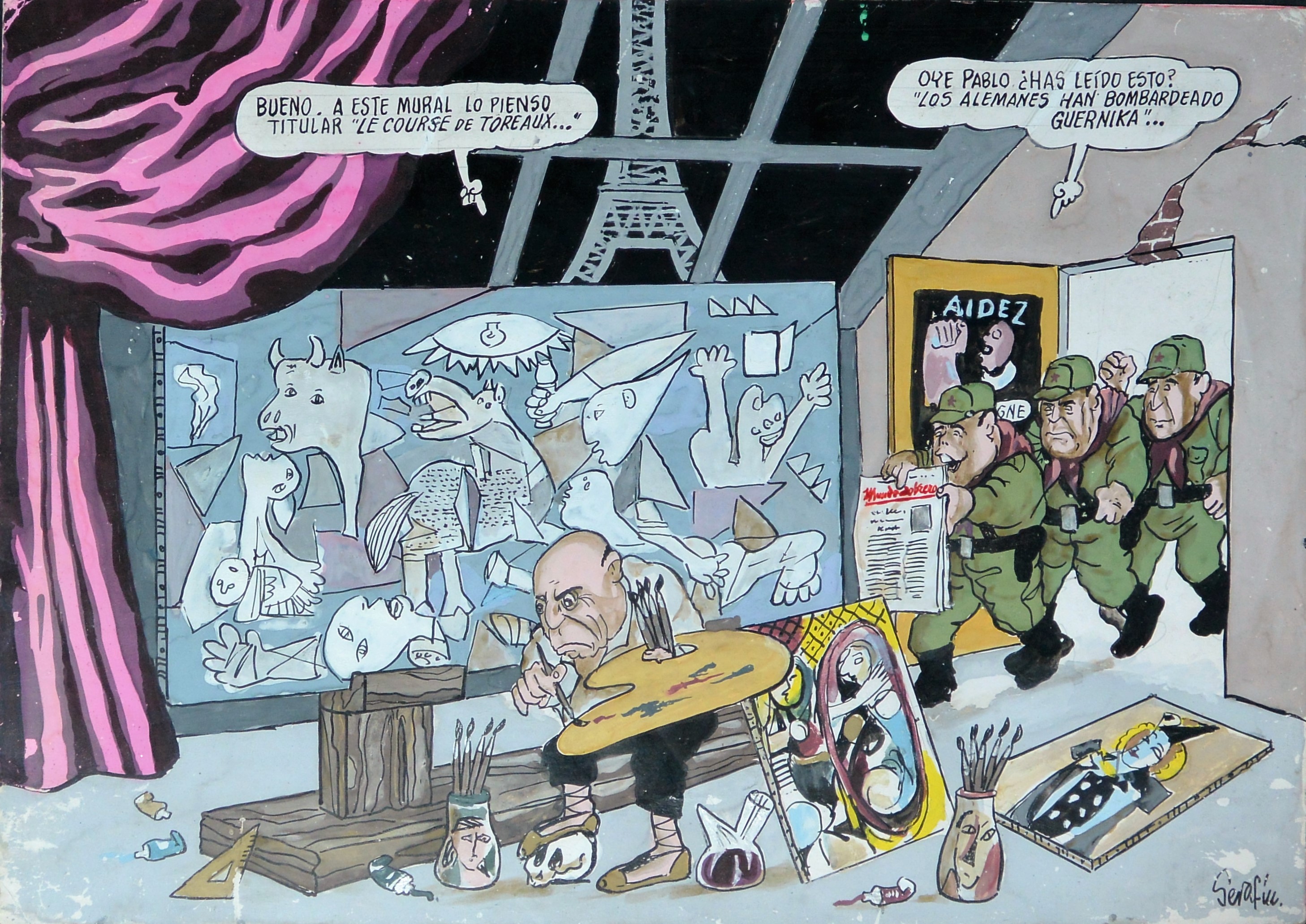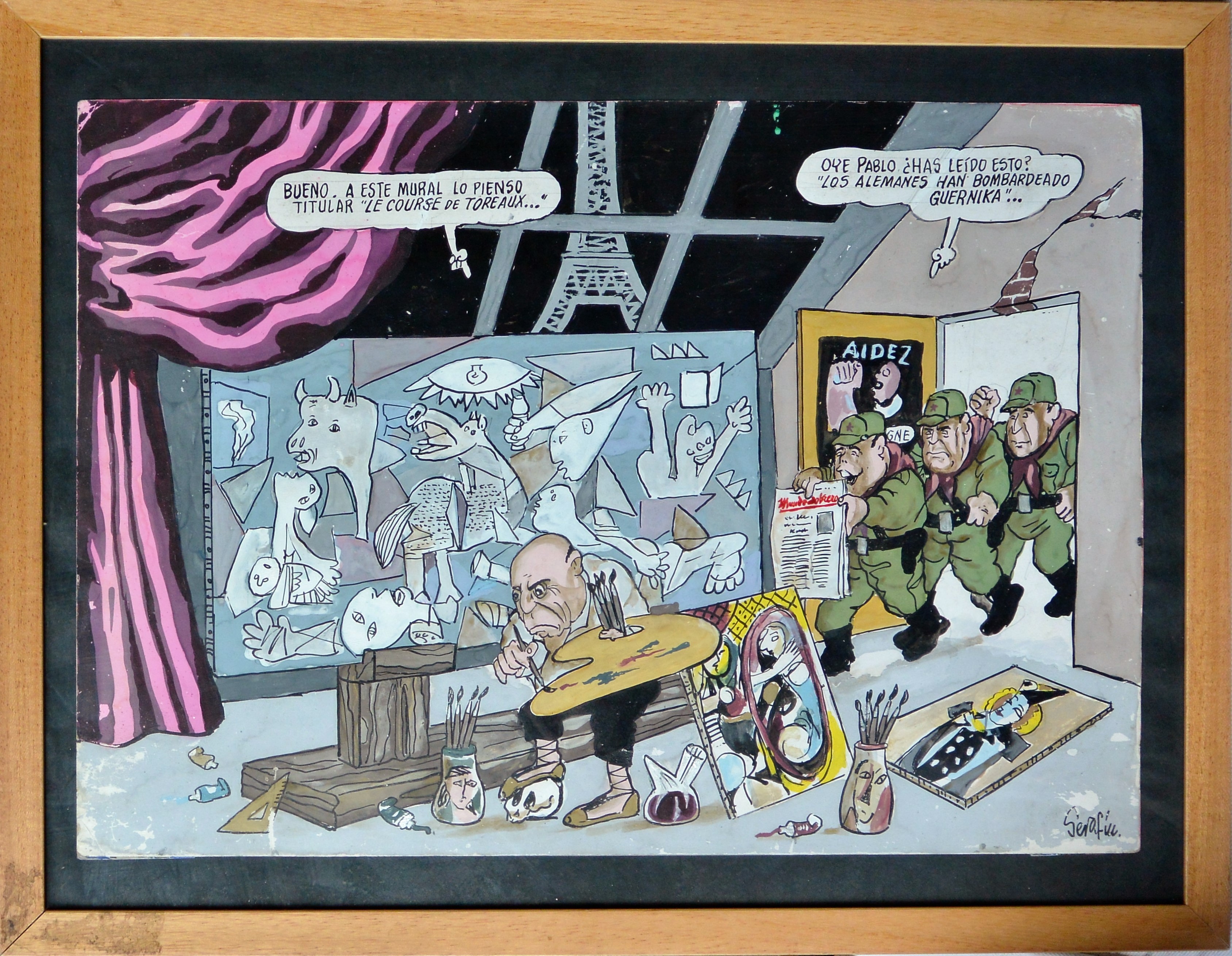 Serafín Rojo, Picasso Guernika, dibujo acuarela papel, enmarcado, dibujo 46×32,50 cms. y marco 41,50×53 cms. Marco incluido