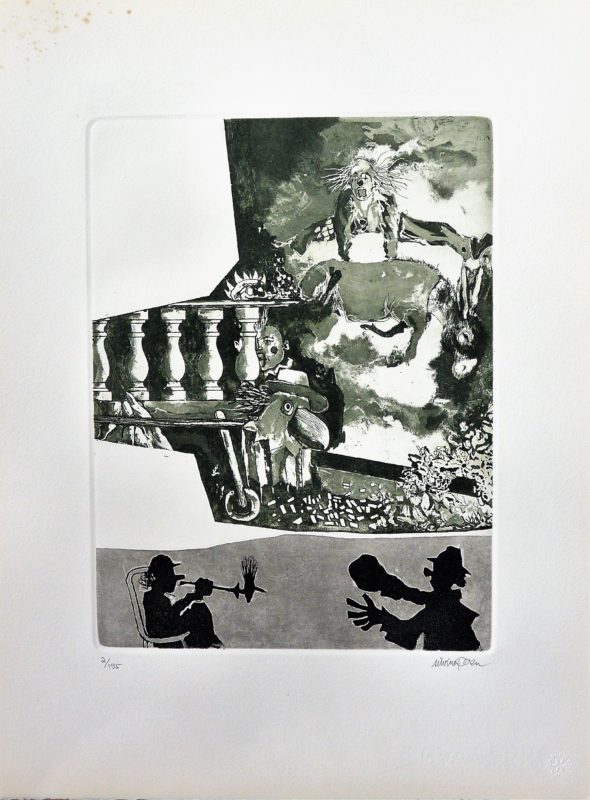 Silvino Poza, Clowns, Salto al burro, grabado aguafuerte, edición 195 ejemplares, numerado y firmado a lápiz, plancha 33×24 cms. y papel 50×38 cms. Pertenece a la carpeta Clowns de Ramón Gómez de la Serna