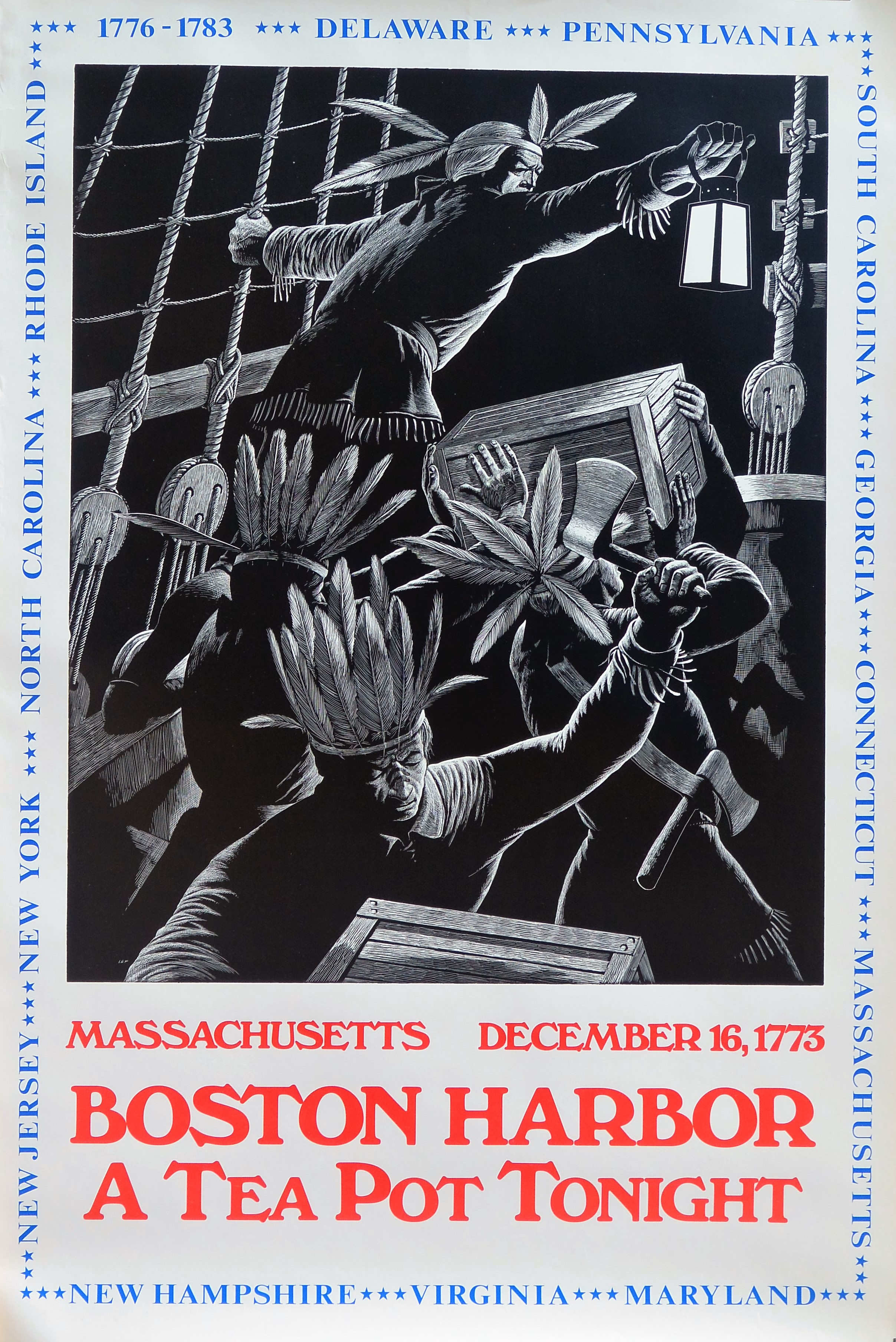 USA, Massachusetts, December 16 1773 – «Boston Harbor, a tea pot tonight» cartel original conmemorativo 200 años independencia EEUU