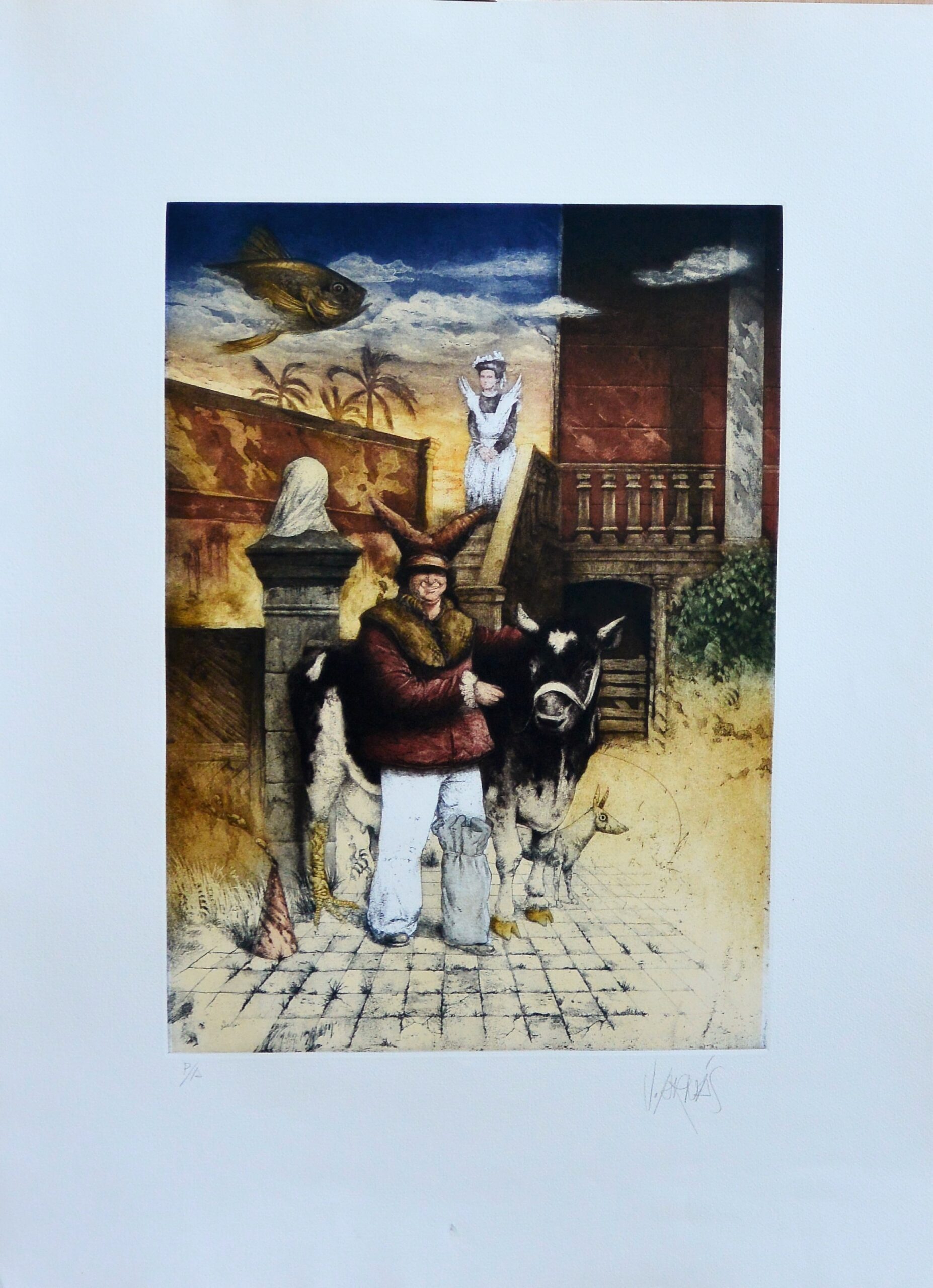 Vicente Arnas, Granja surrealista, grabado aguafuerte y aguatinta, numerado pa y firmado a lápiz, plancha 50X35 cms. y papel 75X56 cms