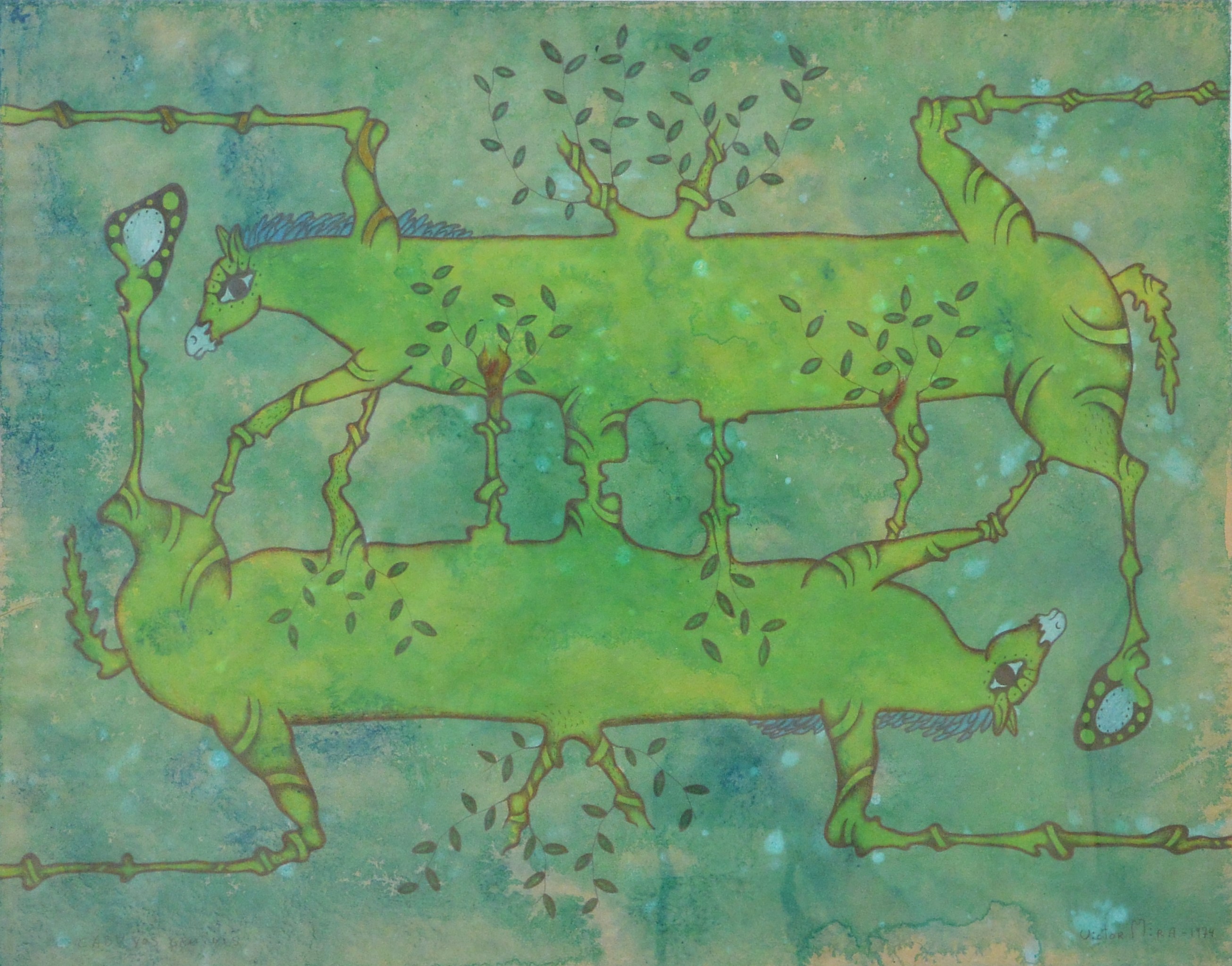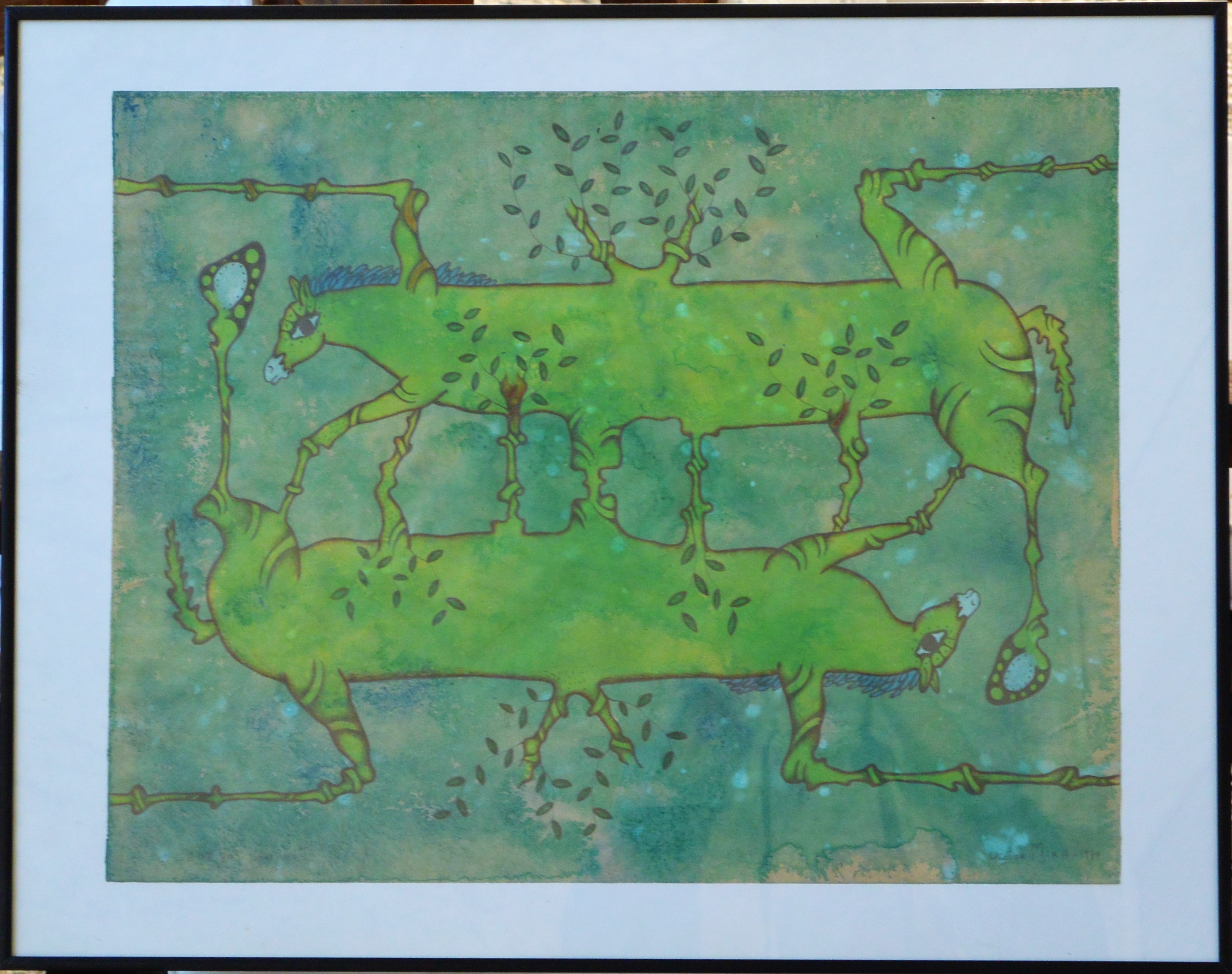 Victor Mira 1979, Caballos verdes, técnica mixta cartulina, enmarcado, pintura 39×50 cms. y marco 48×61 cms. Marco incluido