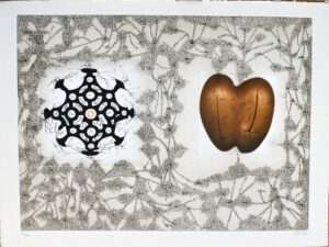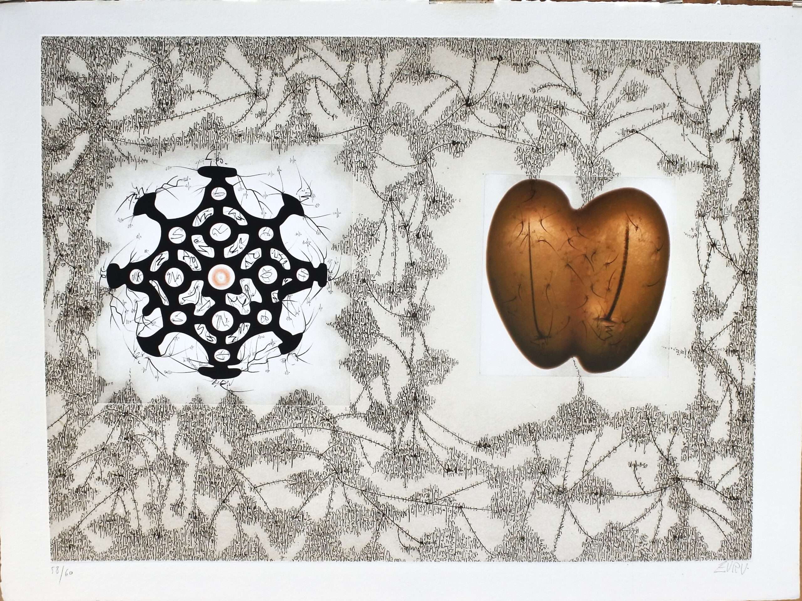Zush – Evru, Composición sin título, grabado aguafuerte y collage, edición 60 ejemplares, numerado y firmado a lápiz, plancha 49×68 cms. y papel 57×78 cms.